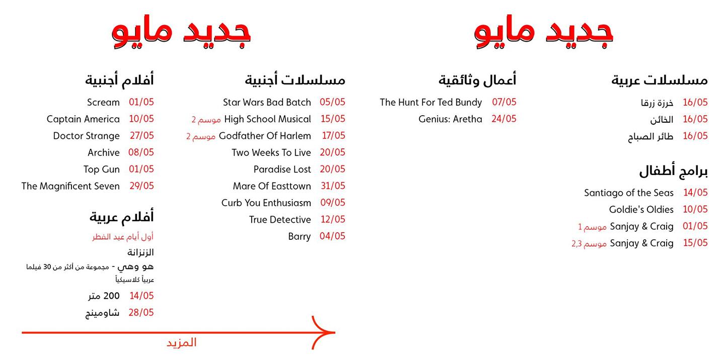 على غرار الأشهر الماضية٬ كشفت خدمة البث التلفزيوني 'أو إس إن' عن قائمة العروض القادمة إلى مكتبتها الرقمية في شهر مايو الجاري٬ وبالأخص في نهاية شهر رمضان الكريم. وذلك عبر تغريدة تستعرض استهداف الخدمة - كالعادة - إضافة مجموعة متنوعة من البرامج التلفزيونية; المسلسلات٬ الأفلام٬ والبرامج الأخرى.. إلخ٬ الحديث منها والقديم نوعًا ما. يحل في مقدمتها أحدث العروض الأصلية والحصرية الجديدة لـ 'ديزني بلس (Disney Plus)' و 'حرب النجوم (Star Wars)'٬ مسلسل الأنيميشن "حرب النجوم: الدفعة السيئة (Star Wars: The Bad Batch)".